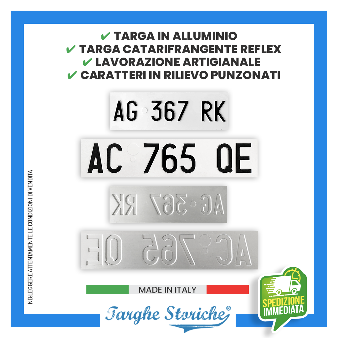CARATTERI IN RILIEVO PUNZONATI: Kit targa anteriore e posteriore con lettere e numeri incisi in rilievo, senza adesivi, per uno stile autentico e leggibilità perfetta