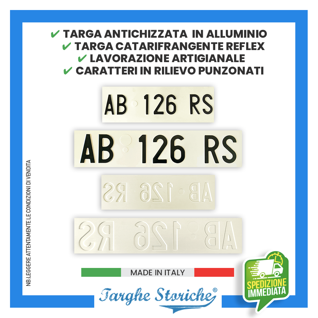 L’ordine della targa è a totale carico del cliente, che ne assume l'esclusiva responsabilità. Con l'acquisto del prodotto, il compratore dichiara di aver preso visione delle informazioni relative all'uso della targa e solleva il venditore da qualsiasi responsabilità. Essendo un prodotto personalizzato, non è possibile effettuare il reso. La targa acquistata ha natura meramente amatoriale e decorativa, nel rispetto della normativa vigente in Italia, potrà essere applicata su veicoli esposti esclusivamente in luogo privato; ogni altro uso improprio potrà far incorrere il proprietario del mezzo in possibili reati e sanzioni.