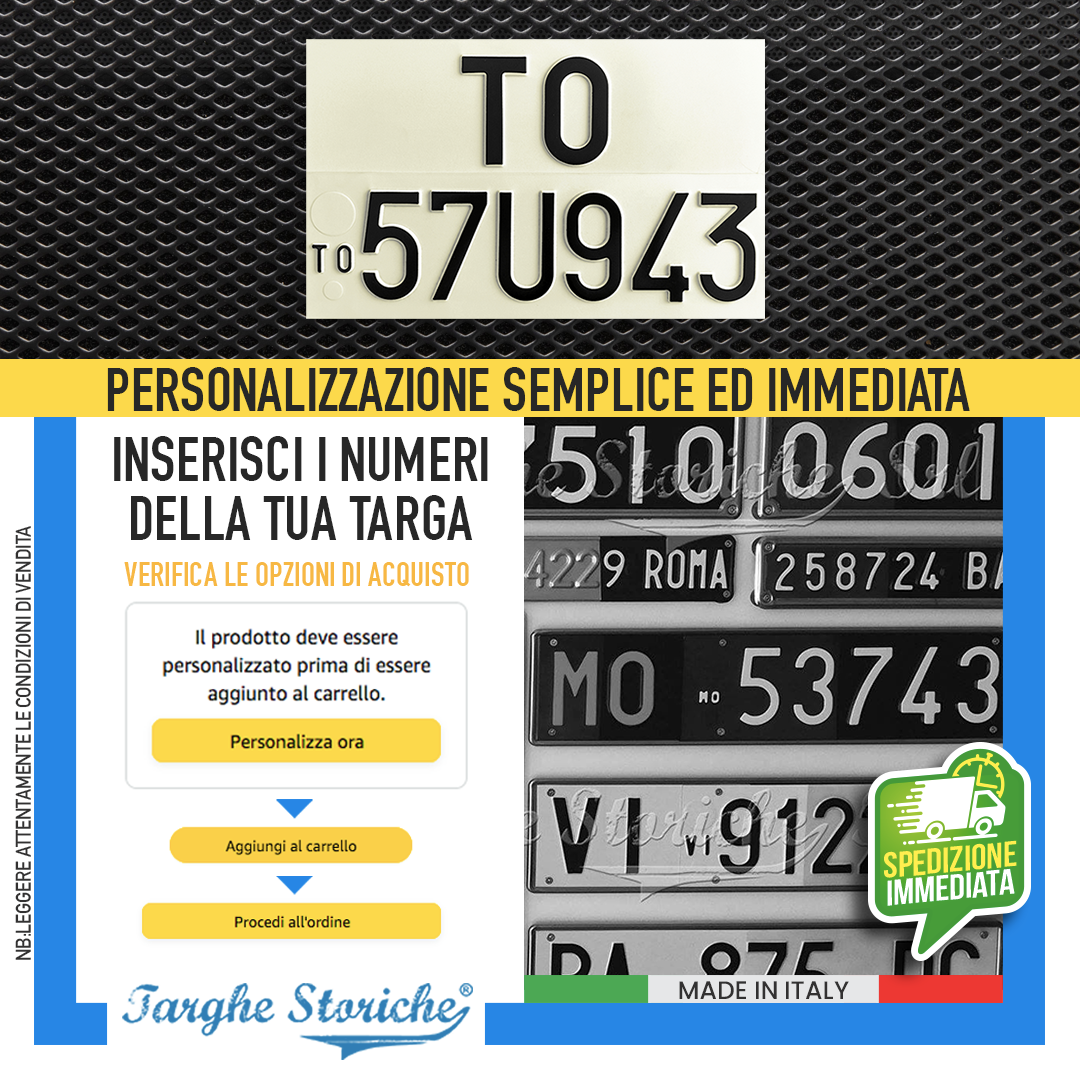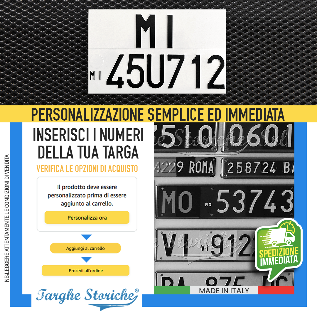 VASTA SCELTA DI PRODOTTI: Nello store di Targhe Storiche troverai un’ampia gamma di repliche di targhe posteriori auto, targhe auto anteriori, moto e targhe ripetitrici. Qualunque sia la tua necessità, troverai la soluzione perfetta