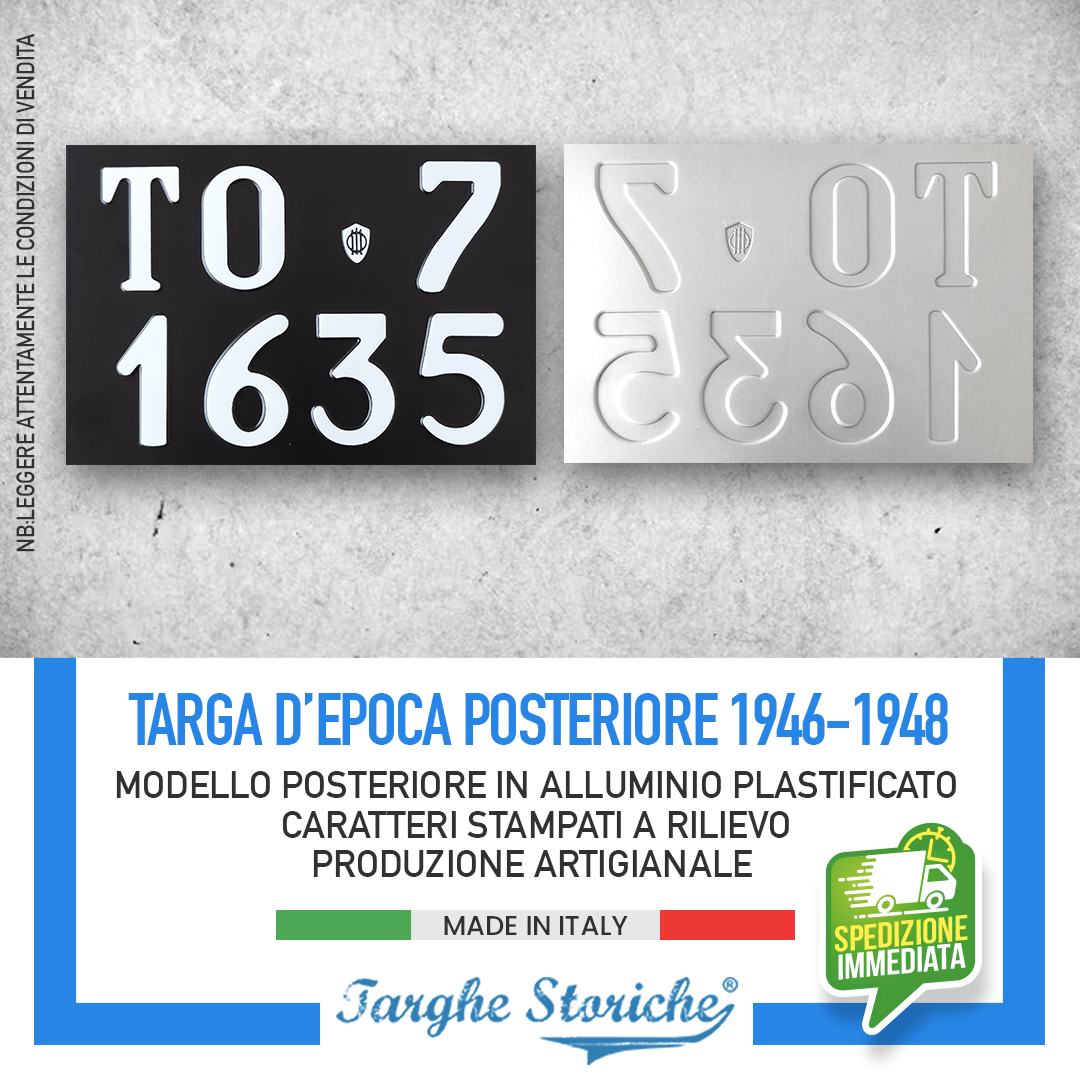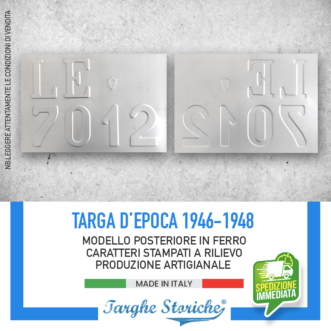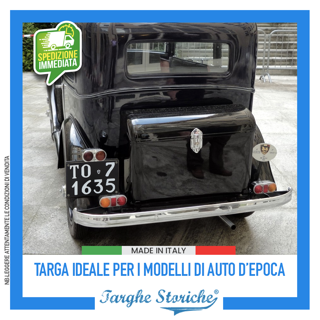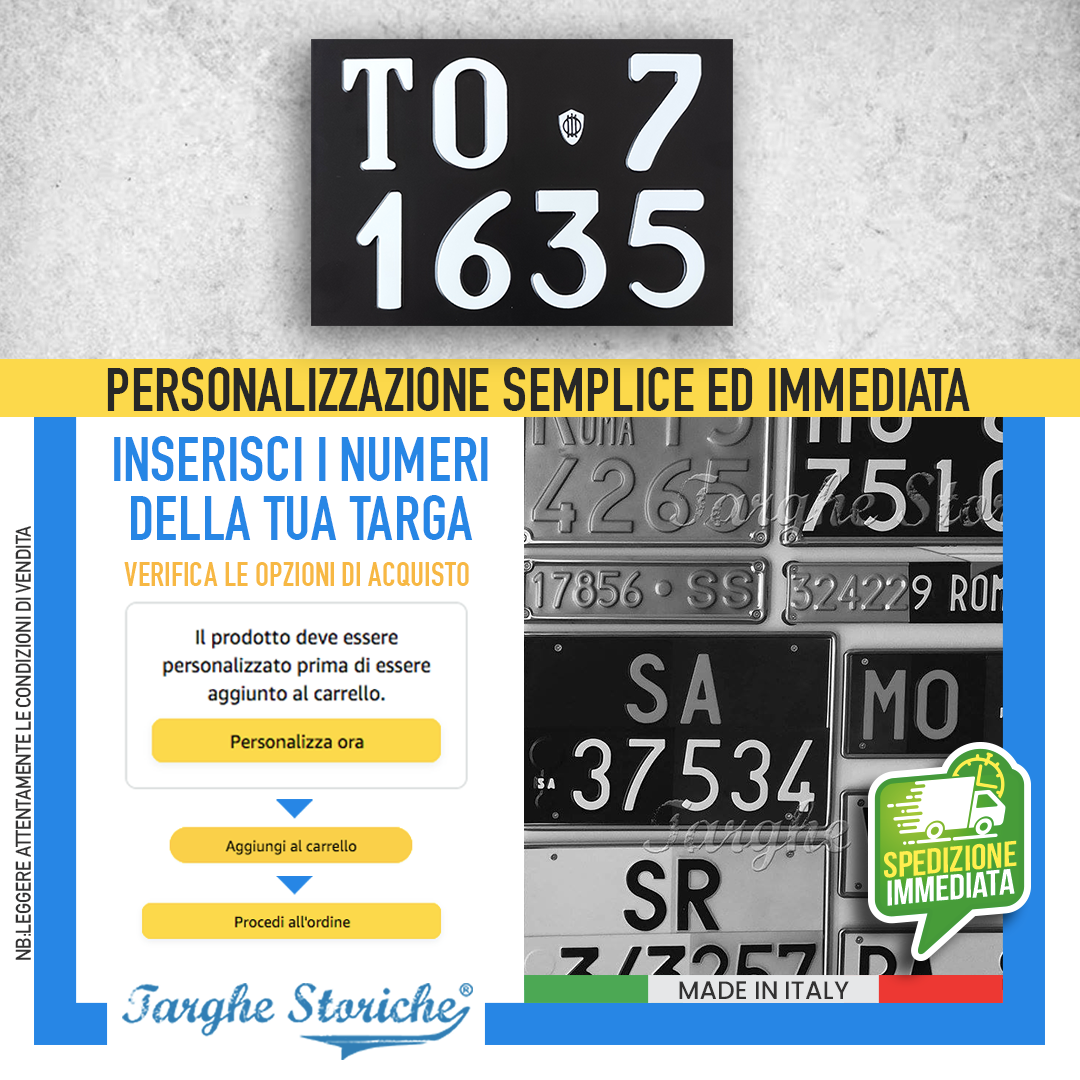 VASTA SCELTA DI PRODOTTI: Nello store di Targhe Storiche troverai un’ampia gamma di repliche di targhe posteriori auto, targhe auto anteriori, moto e targhe ripetitrici. Qualunque sia la tua necessità, troverai la soluzione perfetta