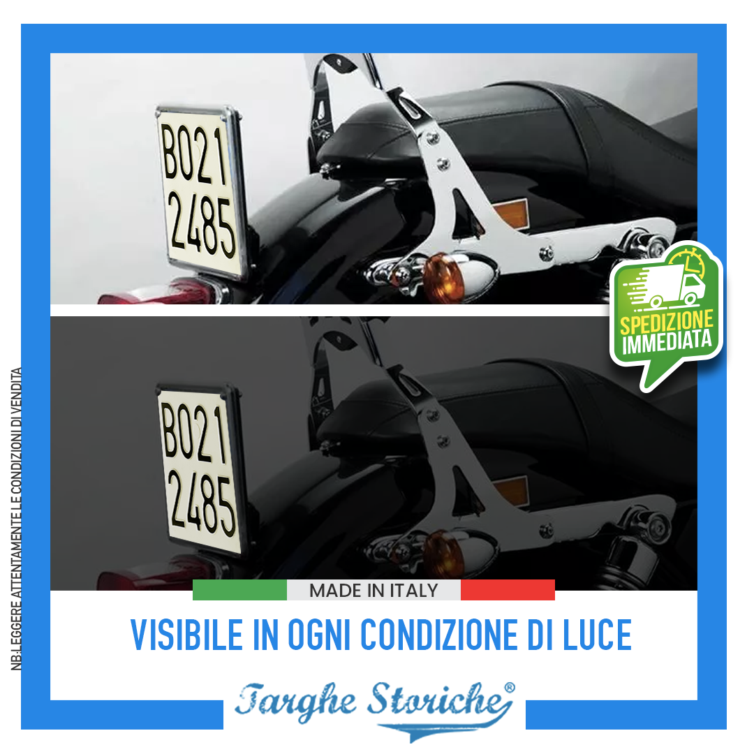 CATARIFRANGENTE: Finitura riflettente che replica fedelmente l’effetto delle targhe originali dell’epoca per un aspetto autentico