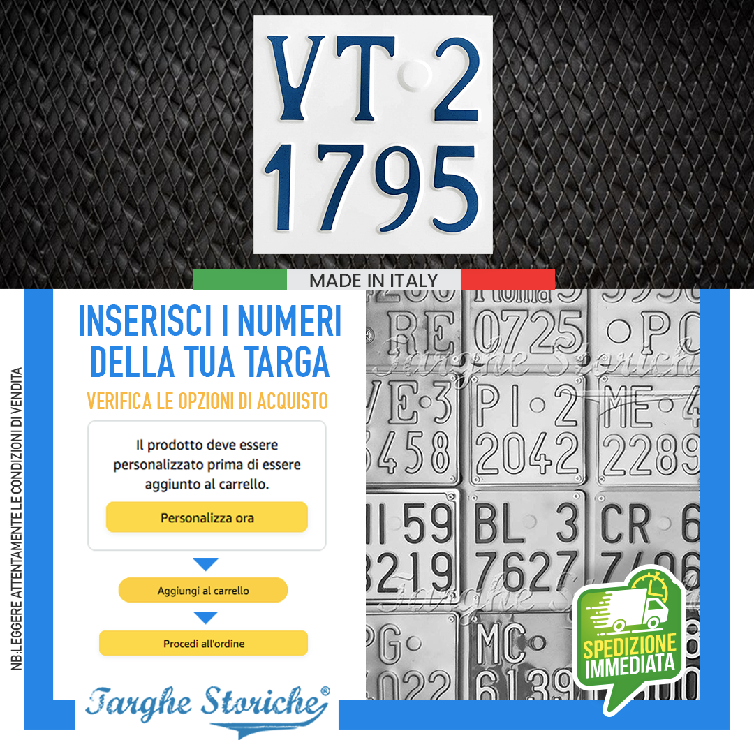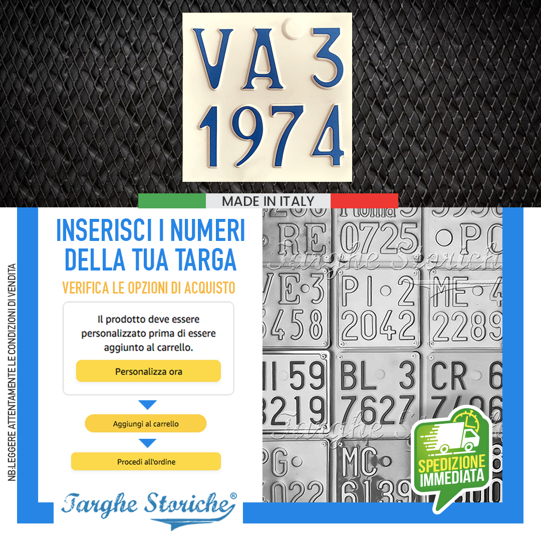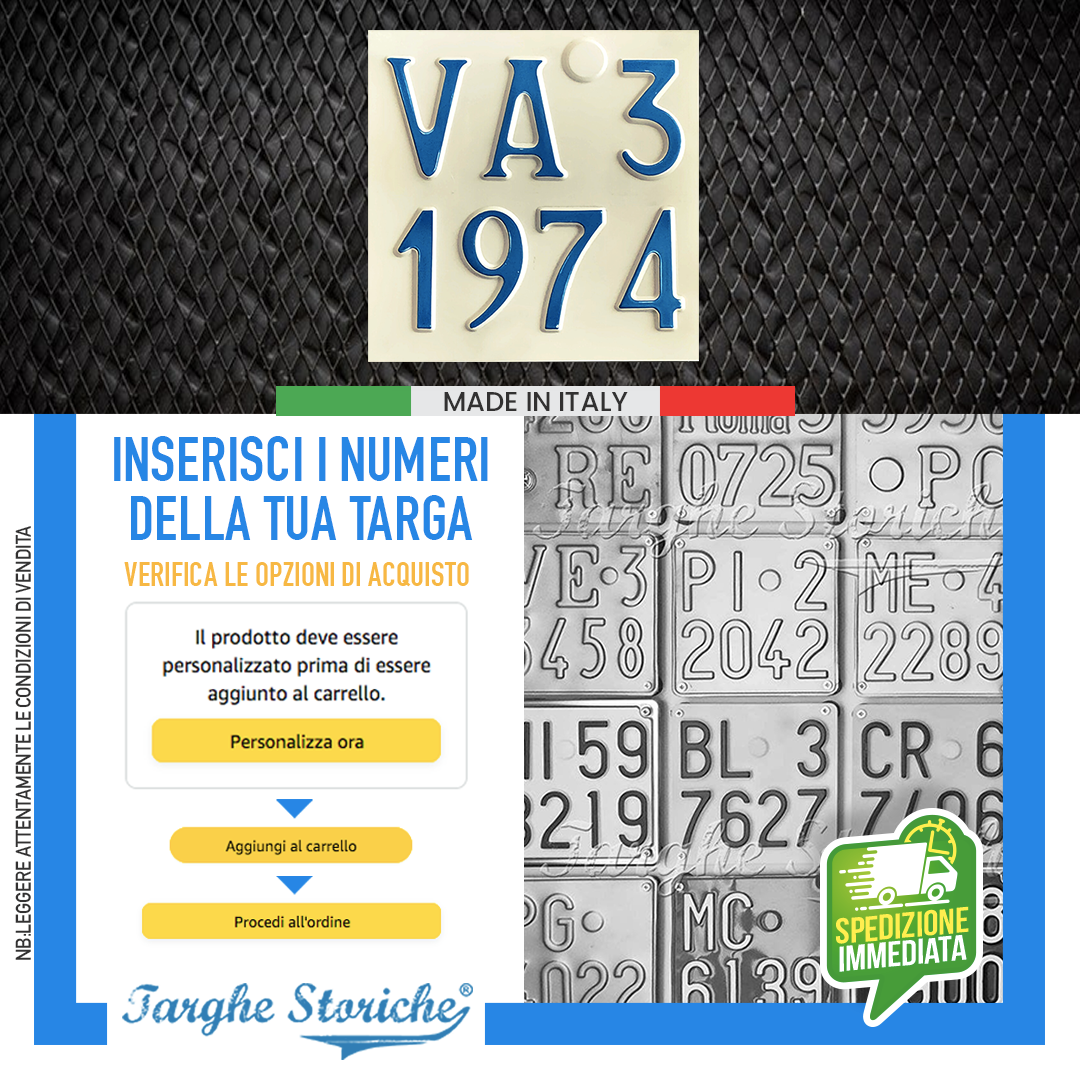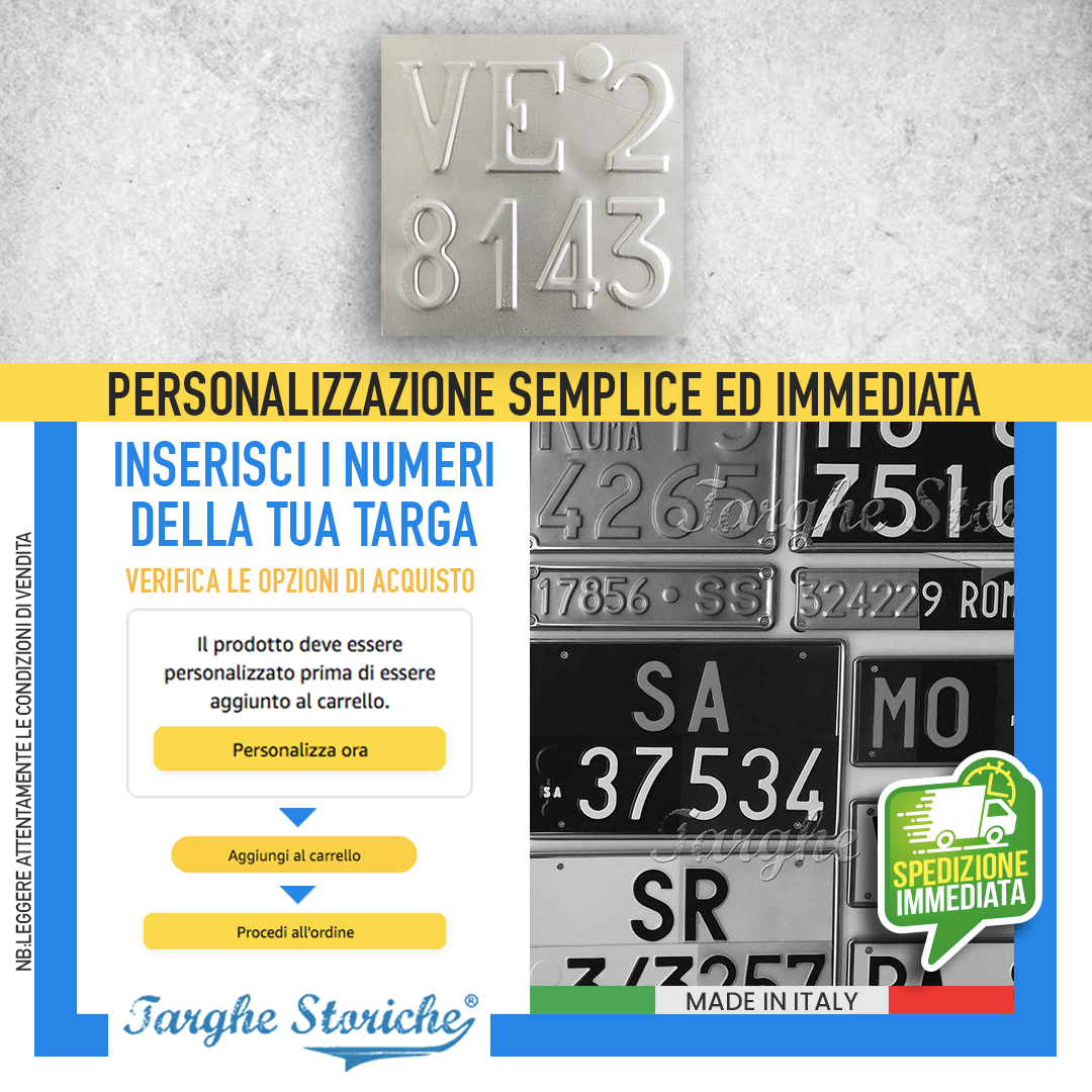 VASTA SCELTA DI PRODOTTI: Nello store di Targhe Storiche troverai un’ampia gamma di repliche di targhe posteriori auto, targhe auto anteriori, moto e targhe ripetitrici. Qualunque sia la tua necessità, troverai la soluzione perfetta